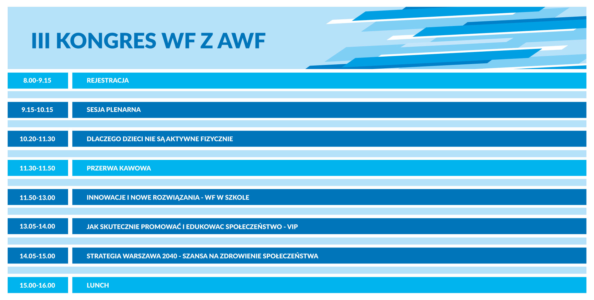Ideą Kongresu WF z AWF „Aktywny dzisiaj dla zdrowia w przyszłości” jest zaprezentowanie idei kompleksowego i innowacyjnego podejścia do aktywności fizycznej dzieci i młodzieży w naszym kraju - „od alfabetu ruchowego do identyfikacji talentu”. Badania kondycji fizycznej i fundamentalnych umiejętności ruchowych potwierdziły bardzo niski poziom sprawności fizycznej i umiejętności ruchowych dzieci w Polsce. Niepokojąca diagnoza wskazuje na pilną potrzebę wdrożenia kompleksowych rozwiązań ukierunkowanych na kształtowanie fundamentalnych umiejętności ruchowych, a także idei alfabetu ruchowego. Działania, które proponujemy mają na celu upowszechnienie i podkreślenie znaczenia aktywności fizycznej w życiu człowieka.
